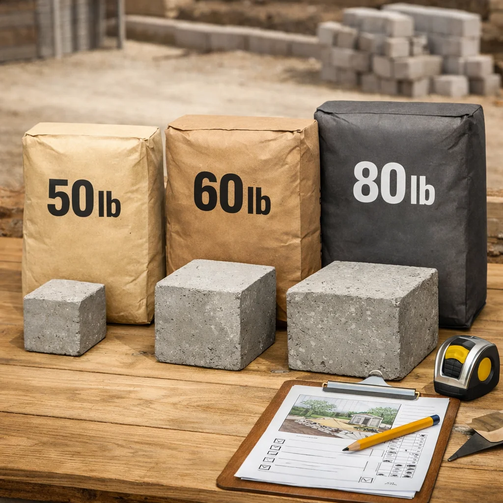 The concrete bag calculator compares 50 lb, 60 lb, and 80 lb bag scenarios so you can estimate how many bags may be needed before you verify product-specific yield.